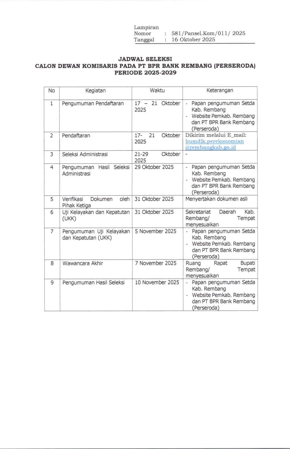 Pengumuman Hasil Seleksi Calon Dewan Komisaris Pada PT BPR Bank Rembang (Perseroda) Periode 2025-2029