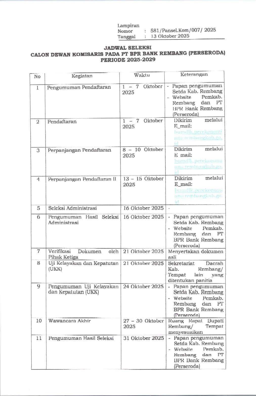Perpanjangan Waktu II Seleksi Calon Dewan Komisaris Pada PT BPR Bank Rembang (Perseroda) Periode 2025-2029