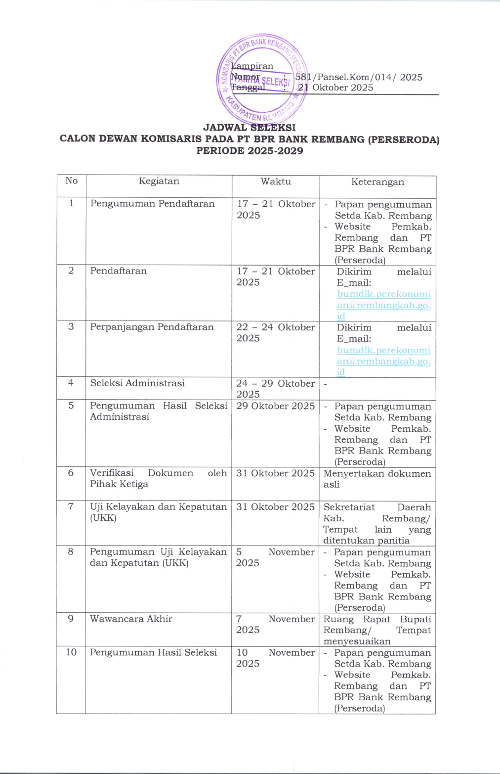 Perpanjangan Waktu Seleksi Calon Dewan Komisaris Pada PT BPR Bank Rembang (Perseroda) Periode 2025-2029